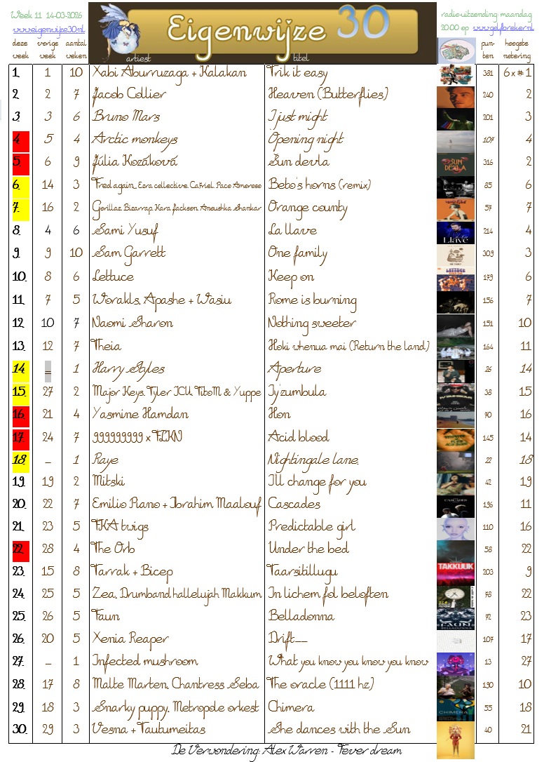 Hier heeft jouw stem wel invloed: https://forms.office.com/r/xfMbp6jPdd]Microsoft - forms.office.com Dit is een van de grootste Eigenwijze 30 hits aan het worden uit de 36 jarige geschiedenis. De Baskische volksmuziek van Xabi Aburruzaga + Kalakan staan nu zelfs voor de zesde week op nummer 1, hun accordeon is zo dansbaar, that's the trik. Jacob Collier doet het rustig aan deze keer en heeft zich helemaal ontfermd over zijn gitaar en de liefde! Stijgt naar 2. Funky disco van Bruno Mars is commercieel en gelikt, maar daar zijn de stemmers van de Eigenwijze 30 ook niet vies van. Deze blijft staan op nummer 3. Zo is de gehele top 3 hetzelfde gebleven. De singles van Xabi Aburruzaga + Kalakan en Sam Garrett staan met 10 weken het langst genoteerd. De nieuwe single van Major Keys, Tyler ICU, TitoM & Yuppe is de snelste stijger van deze week. 3 _ nieuwe binnenkomers; Harry Styles (pop), Raye (soul / traditionele pop) en Infected mushroom (psytrance) 4 stippen 3 superstippen voor; Fred again.., Ezra collective, Ca7riel, Paco Amoroso, Gorillaz, Bizarrap, Kara Jackson, Anoushka Shankar, Harry Styles, Major Keys, Tyler ICU, TitoM & Yuppe en Raye. 🎧 Podcast https:// eigenwijze30.nl/mp3/Eigenwijze30_26-09.mp3 ▶️ YouTube afspeellijst: https://www.youtube.com/playlist?list=PLYxxkXDZlxxe-EoZ5f3t62O8ZwetUbwVK 🎶 Spotify playlist: https://open.spotify.com/playlist/56zVbCZhcqV53obBZd6fSd?si=89348b7e791c44e8 Het gedrukte exemplaar: https://eigenwijze30.nl/images/ew30-2026week11.jpg 🗳 Stem voor de volgende Eigenwijze 30: https://forms.office.com/r/xfMbp6jPdd Stemmen kan tot 23 maart 15:00 Eigenwijze 30 week 11 van 2026